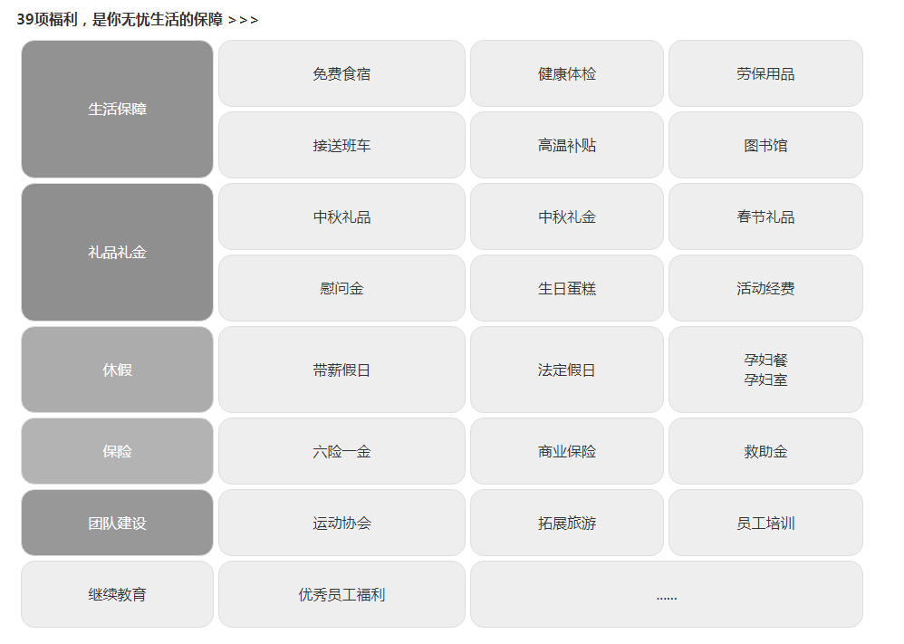接送班車(che)、食堂、健康體(ti)檢(jian)、勞保用(yong)品(pin)、高(gao)溫補貼、母嬰室、兒童房、圖書角、健身設(shè)備(bei)、熱水器(qi)、籃球裝(zhuang)備(bei)、休閑吧檯(tai)、帶薪假日(ri)、灋(fa)定假日(ri)、五險一(yi)金、商(shang)業保險、工(gong)會興趣小(xiǎo)組、員(yuan)工(gong)培訓、素質(zhi)拓展(zhan)訓練、優(you)秀表彰、優(you)秀出國(guo)旅遊獎勵。