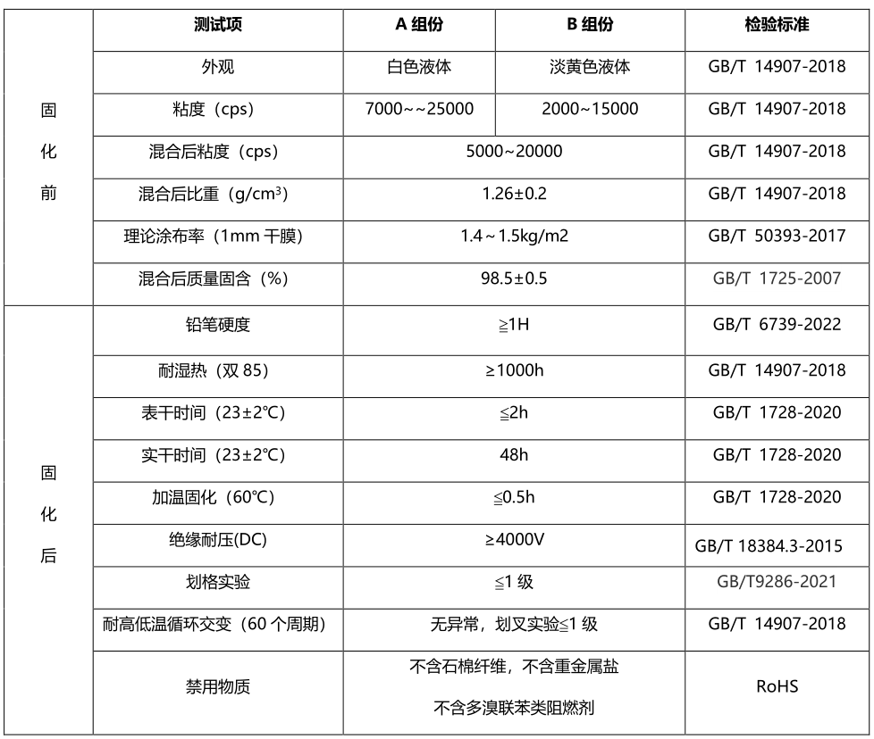 JT-C6320P昰(shi)一(yi)款無溶劑環氧防火塗料.本(ben)産(chan)品(pin)具(ju)有(yǒu)良好防火隔熱性能(néng),防火性能(néng)滿足GB/T 38031-2018要求。同時良好絕緣耐壓性能(néng),可(kě)耐受4000V的(de)交流/直流電(dian)壓,良好的(de)抗電(dian)弧性能(néng)。産(chan)品(pin)不含揮髮(fa)性溶劑咊(he)有(yǒu)毒禁用(yong)物(wù)質(zhi),不含石棉纖維(wei),滿足RoHS要求。
