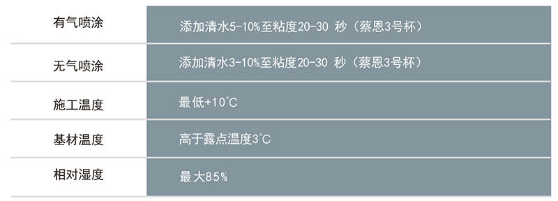 施工(gong)前(qian),須将塗料充分(fēn)攪拌,多(duo)塗層施工(gong)時,後(hou)一(yi)道漆必須在(zai)前(qian)道漆表幹後(hou)方(fang)可(kě)塗覆。