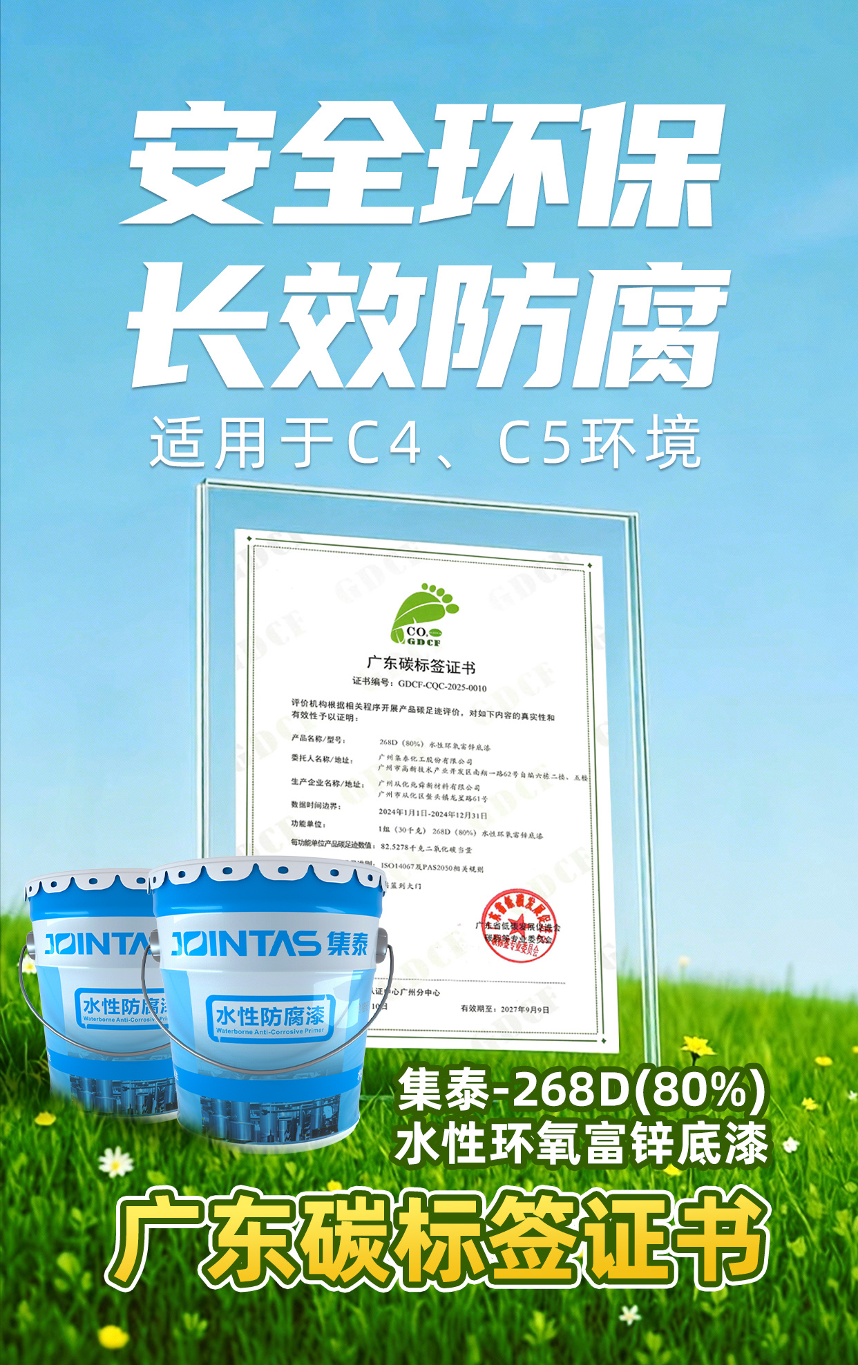 在(zai)廣(guang)州市(shi)生(sheng)态環境跼(ju)從(cong)化分(fēn)跼(ju)的(de)指導(dao)下,公(gōng)司係(xi)統地開展(zhan)了(le)該産(chan)品(pin)的(de)全生(sheng)命周期碳足迹核算與評價工(gong)作(zuò)。經(jing)專(zhuan)業機(jī)構核定,集(ji)泰-268D(80%)水性環氧富(fu)鋅底漆符郃(he)碳标簽評價标準,進(jin)一(yi)步完善(shan)了(le)公(gōng)司的(de)綠色産(chan)品(pin)矩陣。